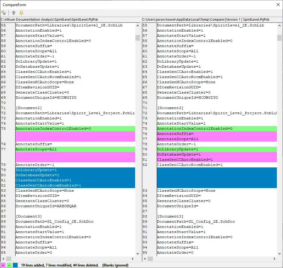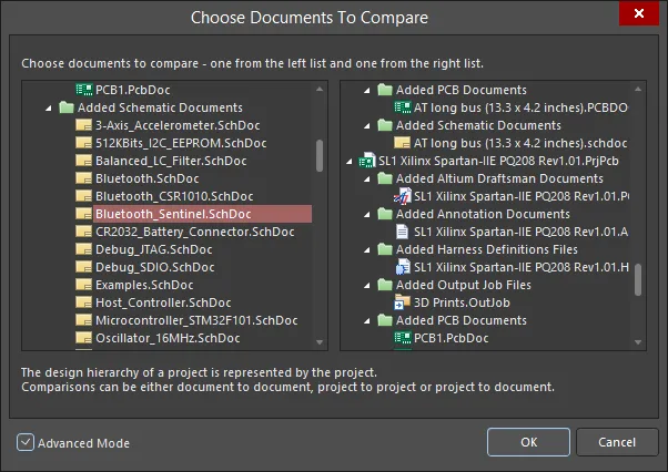 For schematic and PCB design and library documents, two versions of the same document can also be graphically compared using the Project » Show Physical Differences command. Ensure that the previous version (typically a backup) is saved with a different name before opening. The backup version of the document does not need to be added to the project; it can be opened as a free document. Run the command to access the Choose Documents To Compare dialog which, when configured in Advanced mode, can be used to select the two versions of the document for comparison.