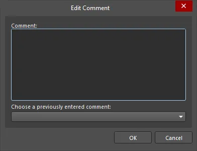 Commit - use this command to check in modifications made to the working copy of the selected file (distinguished by the Status Modified) into your VCS repository. After launching the command, the Edit Comment dialog will open. Enter a new comment or select a previous comment and click OK to commit the document(s). The latest copy of the file in your working folder will be checked in and the associated revision number incremented - see Commit Whole Project above.