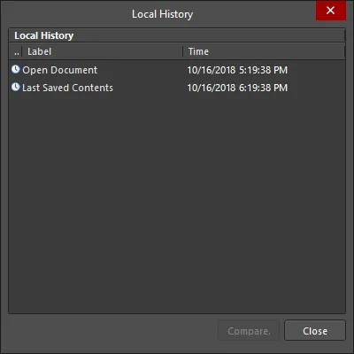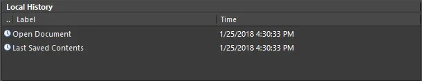 The local history for the active document in the design editor window also can be accessed using the Project » History & Version Control » Local History (Legacy) command from the main menus. The Local History dialog will open, showing the current version of the open document, the last saved version of the document, and any previously saved and stored back-ups.