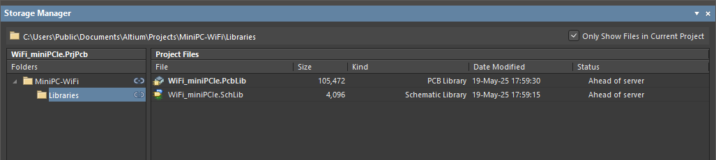 If the active document is an SVN Database Library file, the folder structure for the symbols and footprints checked out to the local working directory will be displayed. This directory is the local workspace from which modifications are committed to the libraries in the linked SVN repository.