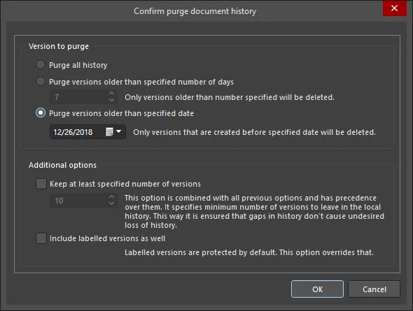 Purge History - delete local history files for the selected document(s). The Confirm purge document history dialog will open from where you can determine exactly which local history files are to be purged. You can elect to purge all versions, versions older than a specified number of days, or versions older than a specified date. In addition, you can opt to keep a specified number of versions, which is combined with the other options but takes precedence over them, ensuring that gaps in history do not cause undesired loss of history. Labeled versions are protected by default but you can choose to override this.