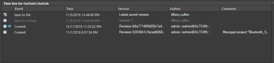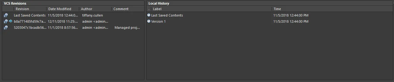 Document history management features are accessed through the Storage Manager panel. The features include the ability to view the differences between documents – both physical and logical – and revert to a previously saved version of a document. Local document history management also works in harmony with an active VCS. Individual designers can manage their own changes using the local history system with the VCS providing a complete team-oriented document management system.